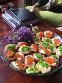 В галерее нас гостеприимно встретили хозяева с бокалом вина и с закуской a la russe.