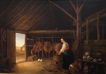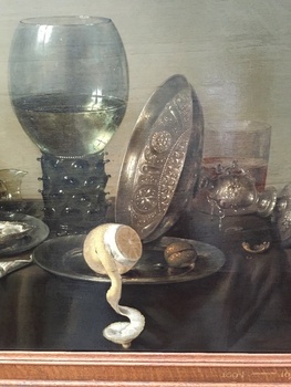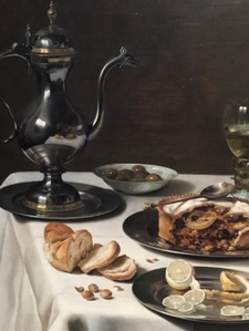 Банкетные натюрморты отличались изобилием дорогих лакомств. Некоторые художники предпочитали более сдержанный подход, изображая на своих картинах посуду, кухонную утварь и копчености. Натюрморт с сырами Флориса Класзон ван Дейка. Ван Дейк слегка выдвинул оловянную тарелку за край стола, чтобы придать картине глубину. Этот композиционный прием впоследствии использовался многими натюрмортистами.