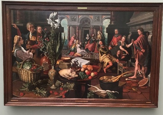 На этой композиции «Христос в доме Марии и Марты» середины 16 века художник P. Aertsen изображает библейский сюжет, уделяя большое внимание натюрморту.