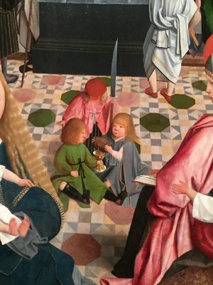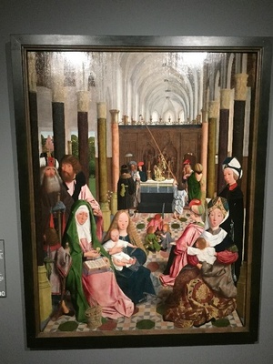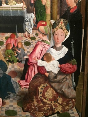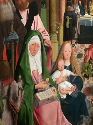 Наше внимание привлекла иконография лиц одной из композиций зала христианского искусства 1100 – 1500 г. «Святое семейство» мастерской Гертгена тот синт Янса. На изображении мы видим Марию в окружении семьи – рядом с ней ее мать Анна, за женами мужья – Иосиф и Иоаким. С права сидит Елизавета с сыном Иоанном Крестителем, который тянет ручку к Христу.