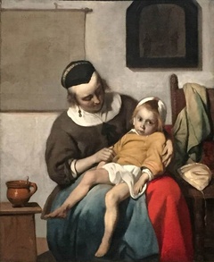Французский художник Габриэль Метсю изображает интимную сцену, мать на коленях которой сидит дочка.