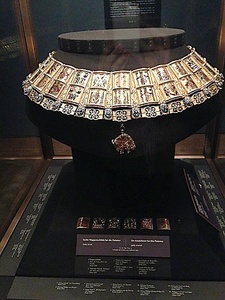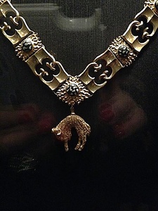 Другой важнейший исторический знак могущества и доблести - Орден золотого руна - рыцарский орден, учрежденный Филиппом III Добрым, герцогом Бургундским в 1430 году в день своей свадьбы с принцессой Изабеллой Португальской. Этот династический орден - одна из самых древних и почётных наград Европы. Его можно увидеть на портретах многих известных людей прошлого. Однако статут ордена существует по сей день в двух ветвях (испанской и австрийской). Награждать испанской ветвью имеет право король Испании, а австрийской — потомок Габсбургов. В наши дни этим орденом награждены 50 наших современников. Шейный орденский знак представляет собой подвеску или кулон в виде Золотого руна (то есть изображения овечьей шкуры), перехваченный «поясом», который крепится к орденской цепи. Подвешивается головой вправо к центральному звену цепи. Орденская цепь состоит из перемежающихся золотых звеньев двух типов: первого — в виде кресал (связанных инициалов — букв «В») и второго — в виде кремня в облаке искр (овал чёрной эмали с каплеобразными точками белой эмали и язычками искр). Используется в особо торжественных случаях.
