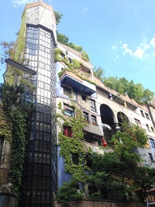 Отдав дань Вене эпохи модерна мы пришли к дому, который унаследовал черты стиля арт нуово – Дом Хундертвассера (Hundertwasserhaus) — жилой дом, построенный Фриденсрайхом Хундертвассером в 1983—1986 годах совместно с архитектором Йозефом Кравиной. Здание отличается «холмистой» этажностью, крыша покрыта почвой с кустарниками и травой, а внутри некоторых комнат-ниш высажены деревья. Это здание напоминает корабль из романа Г.Маркеса «Сто лет одиночества», который каким-то чудом оказался в джунглях, вдали от моря.