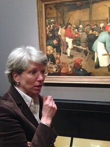 Начальник отдела учебных программ провела для нас экскурсию по знаменитой коллекции живописи, которая обладает целостностью и имеет свою специфику. По словам австрийского искусствоведа Вольфганга Прохазка: «Задача подытожить общий характер коллекции живописи Музея истории искусств, безусловно, нелегка, хотя и менее сложна по сравнению с подведением итогов других больших коллекций, хранящихся по обе стороны Атлантики: менее сложна потому, что коллекция имеет специфичную внутреннюю форму и чрезвычайно тесно связана со странами, в которых почти 500 лет правил Дом Габсбургов. Наиболее важные для коллекции картины происходят из Германии, католических Южных Нидерландов и Северной Италии, в то время как Франция, Голландия, Англия и итальянские города-государства позднего Средневековья не охвачены ее диапазоном. Особый статус имеют несколько испанских картин. Великие правители, Габсбурги испытывали любовь ко всему завершенному, совершенному а, значит, уже прошедшему процесс неуклюжего становления. В коллекции мало работ «ранних» периодов развития стилистических направлений, работ, стремящихся к внутренней завершенности, ни одной картины XIII-XIV вв., полностью проработанные, совершенные, даже несколько декоративные образы, утонченность, непринужденная элегантность без малейшего намека на хвастовство. Сама коллекция воспринимается как декоративное целое. Вкус Габсбургов «благочестив», но без фанатизма, и эротический стимул, возможно, не столь сильный, как у их кузнецов испанцев, играет тут одну из главных ролей. В любом случае, ханжество не было свойственно Габсбургам до не столь давнего времени. Все великие коллекционеры Дома Габсбургов любили ранненидерландскую живопись, Брейгеля, Тициана, Дюрера, а из более поздних периодов – Рубенса и Ван Дейка. До сегодняшнего дня венская коллекция живописи обозначена маркой их «семейного вкуса», каким бы он ни был тенденциозным».