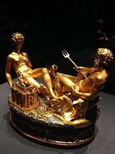 В музее мы увидели всемирно известную Saliera(Солонку). Она представляет собой единственную сохранившуюся ювелирную работу Бенвенуто Челлини (1500-15710, одного из самых значительных ювелиров и скульпторов эпохи Ренессанса. Он создал свой шедевр для Франциска I, короля Франции. Это аллегорическое представление мира. Стихии Воды и Огня противостоят друг другу: бога морей Нептуна несут морские кони, рядом находится корабль, а Теллус, римская богиня Земли, восседает на слоне, сбоку от нее видна миниатюрная триумфальная арка. Символизируя стихию Огня, у ног Теллус стоит саламандра, смотря вверх на нее. Четыре дующих толстощеких путти на цоколе обозначают ветра и, таким образом, четвертую стихию – Воздух, а также страны света. Кроме того, на пьедестале изображены олицетворения времен суток. Пьедестал из эбенового дерева стоит на деревянных роликах: передвигая солонку, король, как властелин, потрясает весь мир. Этот предмет не был бы настоящим экспонатом Кунсткамеры, если бы он при этом не имел практического назначения, присущего столовому прибору: в кораблике Нептуна есть место для соли и, откинув крышу триумфальной арки на шарнирах, туда можно насыпать перец.