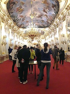Мы очередной раз убедились в справедливости утверждения, что Вена – это «город дворцов» или «город-дворец», когда на третий день нашего арт-тура посетили зимнюю резиденцию Габсбургов Хофбург (Hofburg), которую еще называют «город в городе» - в Ховбурге насчитывается 2600 залов и комнат. Хофбург - это исторический центр Вены. Хофбург строился как средневековый замок («хоф» и «бург» — императорский двор, готовый к обороне) и был обнесен крепостной стеной, выполнявшей оборонительную функцию. Стена была частично разрушена во время войны с Наполеоном, но окончательно стену снесли только в 1857 году. Многие поколения Габсбургов жили внутри городских стен, не выходя за их пределы, и даже хоронили своих близких внутри города, рядом с собором св. Стефана. Естественно, что городская стена ограничивала развитие города. Дворец строился, постоянно перестраивался, расширялся и рос вместе с могуществом Габсбургов. Резиденция императора находилась в этом дворце до 1918 года. Сейчас в здании дворца размещается официальная резиденция президента Австрии.