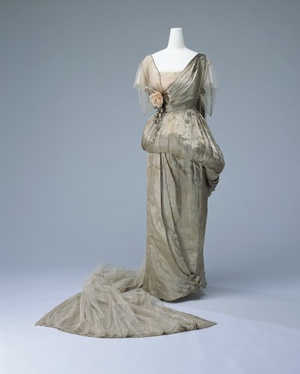Парадное придворное платье со шлейфом. Модный дом «Ворт». Франция, 1914 г.. Серебряная тафта ламе, шелковый тюль, блестки, стразы, искусственные цветы из шелка; ткачество, вышивка блестками и стразами. Коллекция Института костюма Киото.