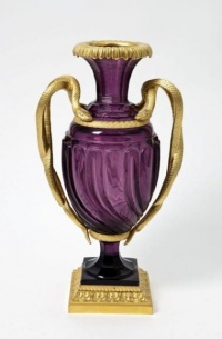 Ваза с ручками в виде змей. Императорский стеклянный завод, 1830-е. Стекло фиолетовое (марганцевое), гранение, бронза, золочение. Высота 42см |