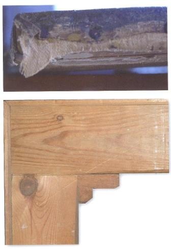 Рис. 1. Небольшой фрагмент укрепления холста саржевого плетения с рисунком «ёлочка». который использовал В.А. Хопман. Рис. 2. Уголок одного из подрамников Хопмана |