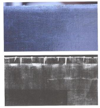 Рис. 4.На рентгеновском снимке видны 2 типа гвоздей. Хопман использовал длинные гвозди для того, чтобы закрепить дополнительную планку к подрамнику, и маленькие для того, чтобы растянуть холст. |