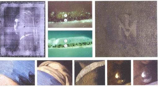 Укрепление холста, которое проводилось дважды в 1882 и 1960 гг., нанесло серьезный урон картине. В нескольких местах Вермеер наложил краску довольно толстым слоем. Он использовал технику импасто (более пастозное, корпусное письмо) для того, чтобы усилить эффект от фактуры различных тканей. Наиболее заметна эта техника в изображении тюрбана, блеска в глазах и жемчужины. Мазки эти, однако, были выровнены во время укрепления холста, по большей части, из-за того, что в XIX в. эта процедура проводилась с использованием тяжелых горячих утюгов. Рис. 15 показывает, как оригинальный рельеф красочного слоя изменился после реставрации.