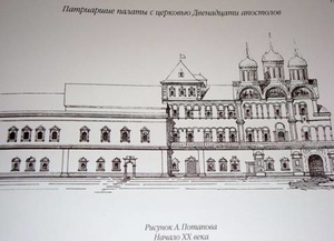 | Внимательно слушаем рассказ Н.В. Рощиной о том, что представлял собой Московский Кремль в XVII веке. | На рисунке начала XX века изображены Патриаршие палаты с церковью Двенадцати апостолов |