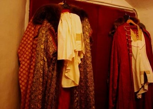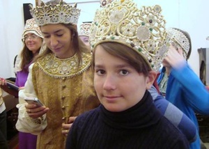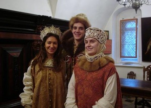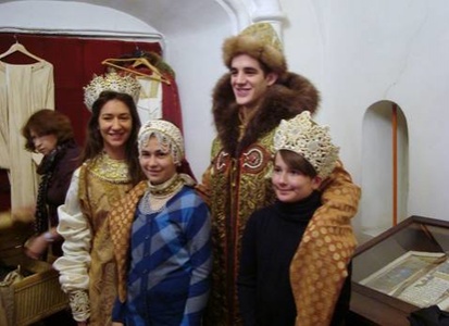 В музее нас ждал сюрприз – встреча с самой матушкой-Государыней. Она радушно приняла нас у себя, показала предметы жилых покоев XVII века, рассказала, как живет, во что одевается, чем занимается она и ее окружение. Чтобы не смущать матушку нашими современными одеяниями, мы согласились на ее любезное предложение примерить боярские костюмы и почувствовали себя настоящими жителями средневековой Руси.