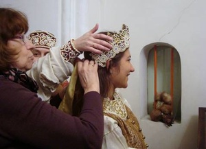 | Примерка женского парадного одеяния – красной рубахи, венца, ожерелья – и дети, и взрослые в восторге. | |