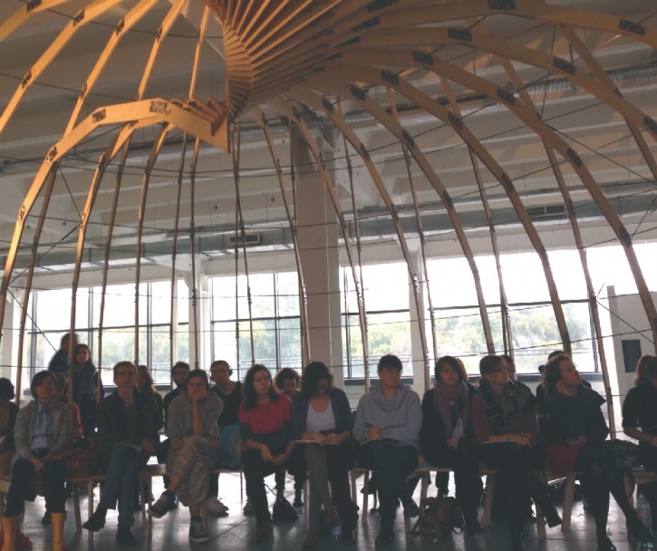 Что же такое Арт Ассамблея? Во-первых, следует сказать, что представляет собой это сооружение. Для размещения участников и слушателей в пространстве экспозиции был установлен павильон, призванный служить местом для дискуссий. Цель замысловатой деревянной конструкции проста: обеспечить максимальную концентрацию внимания, а заодно и обездвижить всех присутствующих, чтобы никто никому не мешал и не нарушал ход презентации. В результате получилась громоздкая клетка с неудобными сиденьями, так и не вместившая всех желающих, в которую было сложно попасть и откуда было непросто выбраться. Тем не менее, благодаря такой конфигурации присутствующих была создана некая общность людей, объединенных не только интеллектуально, но и физически. В этом контексте интересно замечание Катрин де Зегер, куратора нынешней Московской биеннале современного искусства: в интервью «Артгиду» на вопрос, будет ли она развивать идею совместных практик и понятия общности в Москве, Катрин ответила утвердительно, «потому что эта идея помогает по-новому определить современный мир, общество». И далее добавила: «Ведь мы находим свою субъективность через «другого».