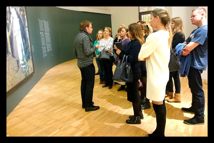 Слушатели окунулись в водоворот мыслей и чувств свидетелей одного из самых драматичных этапов в истории России. Многоголосье искусства революционного времени отразилось и в масштабе выставки, на которой представлено более 140 экспонатов, и в широте подбора авторов живописных работ и в атмосфере некоторой “изломанности” и неоднозначности выставочного пространства. Нам представилась удивительная возможность сравнить полотна, которые редко попадают в фокус внимания посетителей вместе. «Азиатские» крестьяне Б.Д. Григорьева и эпичные крестьянки Зинаиды Серебряковой, «лубочные» картины Б.М.Кустодиева и эскапичные работ К.А. Коровина, приметы современного города Аристарха Лентулова и образы горожан К.С. Петрова-Водкина предстали перед посетителями выставки в новом свете. Известный критик и кандидат искусствоведения, Кирилл Светляков обратил внимание слушателей на каждое произведение и подробно рассмотрел предысторию его создания, особенности живописной техники и, не всегда явную, проблематику 1917 года.