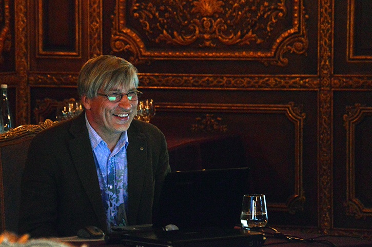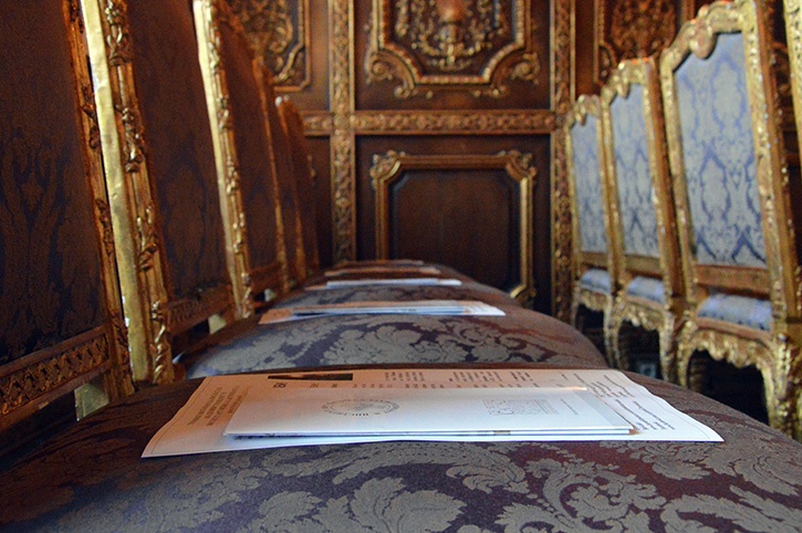 Мероприятие проходило в «Парадном» зале дворца, выполненном в технике буазери, когда основным декоративным элементом являются настенные панели из драгоценных пород дерева, украшенные великолепной резьбой.
