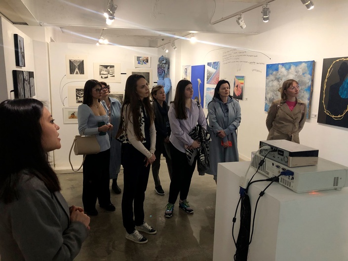 Мастер-класс был разделен на две части. Первая часть – выставка «Туманность Андромеды. Религии внеземного спасения». Это кураторский проект Марии Нам – члена команды InArt. Вторая часть была посвящена анализу арт-менеджмента. Студенты познакомились с философией современного искусства: что сегодня ценится больше всего и как это выгодно представить клиенту.