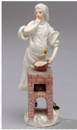 Вторая серии «Парижских разносчиков»: «Продавщица персиков», «Повар у плиты», «Продавец абсента» (слева направо). По модели Петера Рейнике, около 1753 /54 гг. Саксония, Мейсен. Фарфор; лепка, роспись надглазурная полихромная, позолота.