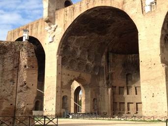 Развалины базилики Максенция - когда-то самого большого здания, построенного на Римском форуме. О былой грандиозности постройки напоминает теперь только монументальный ритм кессонов на величественных древних сводах.