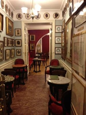 В этом кафе бывали Андерсен, Гете, великие путешественники и ученые. Есть здесь и уголок Н.В, Гоголя - на картине изображен он сам, в этом же кафе в кругу своих почитателей. |