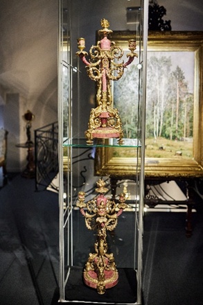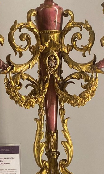 Мемориальные парные канделябры из письменного гарнитура императрицы Марии Федоровны. В гарнитур входило 15 предметов: канделябры, ящик для бумаг, чернильница, бювар, колокольчик, вазочка для перьев, печать, чашка для песка, ножик для разрезания бумаги, ножик для чистки бумаги и подсвечники. Рисунки этих предметов были разработаны художником и архитектором Гаральдом Андреевичем Боссе в 1866 году для изготовления на Петергофской гранильной фабрике по случаю свадьбы цесаревича Александра Александровича и цесаревны Марии Федоровны. Бронзовые детали с монтажом были заказаны через фирму «Никольс и Плинке».