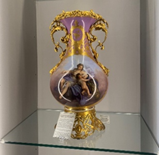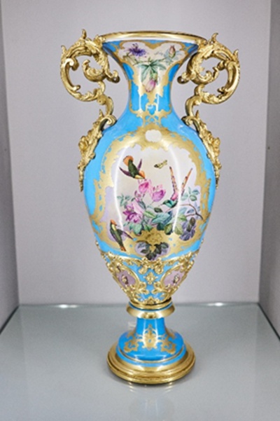 Представленные в собрании галереи парные дворцовые вазы в бронзовом оформлении богато декорированы цветочной росписью и экзотическими птицами. Конкретно эти вазы экспонировались на ежегодной предрождественской выставке, организованной в концертном зале Зимнего дворца в декабре 1861 года, и были приобретены для императрицы Марии Александровны.