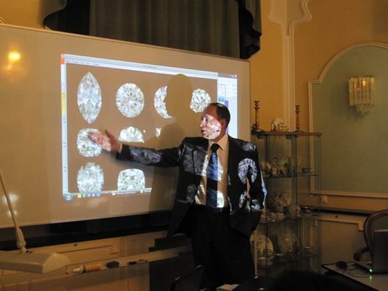 Ведущим семинара являлся руководитель Геммологического центра МГУ Юрий Шелементьев, занимающийся глубоким изучением оптики бриллианта и восприятия камня человеческим глазом. Ученый впервые знакомил ценителей драгоценных камней с такими научными терминами, относящимися к позитивным оптическим эффектам в бриллианте, как Brilliancy, то есть яркость, сверкание камня, белые вспышки света на ограненном камне; Fire, что означает игру, огненные цветные вспышки на гранях камня. Эти понятия используются для характеристики лучей, которые человек видит в результате дисперсии света (способности вещества преломлять лучи света с различной длиной волны, то есть различного цвета) в бриллианте. Наконец, Scintillation, сцинцилляция, явление, возникающее при изменении положения камня относительно источника света или глаза наблюдателя. При сцинцилляции калейдоскоп белых и цветных участков бриллианта причудливым образом изменяется, вспыхивают различные грани камня, цвета огня загораются на поверхности, сменяя друг друга. Все эти удивительные характеристики помогут знатокам и любителям камней, в следующий раз, взглянув на бриллиант, гораздо глубже и профессиональней оценить его стоимость и красоту.