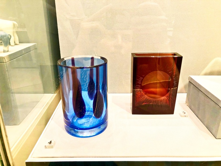 На выставке также представлены работы завода «Неман». Это художественное стекло отличается тонким слоем и пастельной цветовой палитрой изделий. Например, знаменитый янтарный неманский цвет.