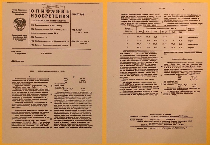 Далее мы проследовали на выставку советского сульфидно-цинкового стекла. Его второе название – русское стеклянное чудо. Секрет технологии: при нагревании стекло меняет цвет, а каким оно получится – в этом и заключается неповторимость результата. Виды стекол (мраморовидное, архитектурное, термочувствительное) разработал выдающийся химик Китайгородский, а их усовершенствование и непосредственно изобретение сульфидно-цинкового стекла принадлежит Е.А. Ивановой.