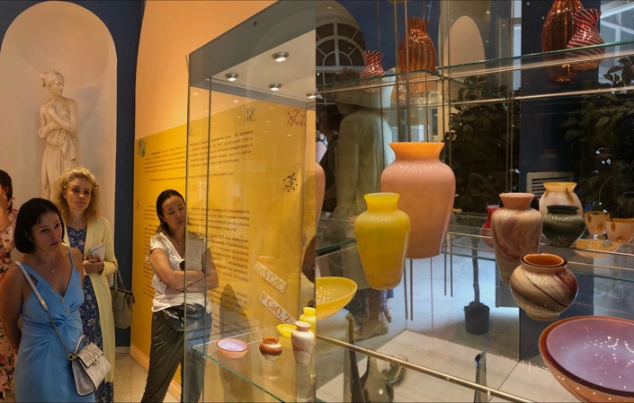 Ольга Александровна – хранитель художественного стекла ГМК, куратор выставки «Стеклянное чудо. Советское сульфидно-цинковое стекло». Под чутким руководством хранителя мы отправились в мир советского стеклоделия, о чем вам сейчас и расскажем.
