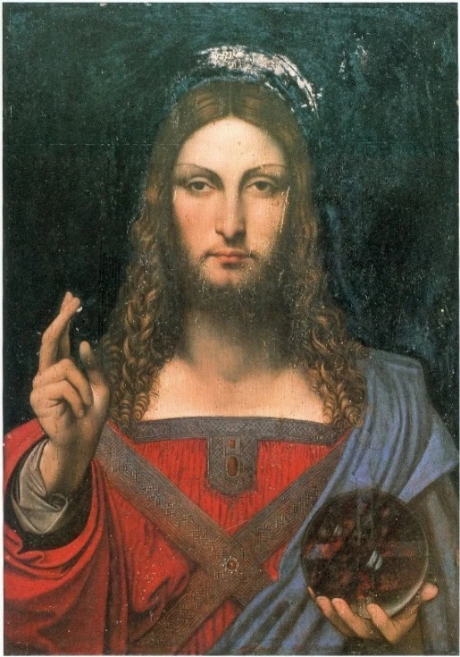 Образ «Сальватора Мунди» восходит к фрагментам Священного Писания, где Иисус называется Спасителем Мира[43]. Прозрачный шар символизирует мир. В разных известных версиях его внешний вид немного меняется. Часто утверждалось, что сфера на картине Кука сделана из горного хрусталя, но это скорее всего стекло[44]. В Неаполитанской версии и в версии Гане мы видим маленькие коричневые точки, которые трудно интерпретировать. Иисус изображен с изящной бородой, в расцвете сил, вероятно, в возрасте тридцати трёх лет, в момент выполнения его миссии на Земле, заключающейся в спасении мира. Несколько историков относили это священное изображение Христа в анфас к разряду чудесных произведений, которые считаются нерукотворными. История этих изображений, так называемых «acheiropolietes» (икона без рук) существует в христианской традиции — например, Эдесский образ или Мандилион, о котором говорится, в частности, в «Золотой легенде». Как считалось, лик Христа отпечатался на мантии художника, посланного к Иисусу правителем города Эдессы для того, чтобы написать его портрет. Иконография Спасителя мира была хорошо известна в Италии во времена Леонардо, но некоторые специалисты считают, что художник мог вдохновиться фламандскими образцами.