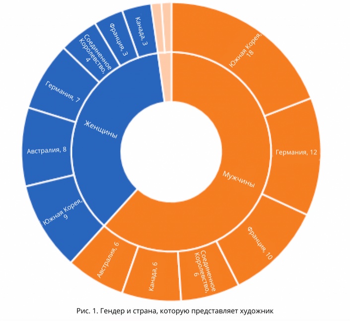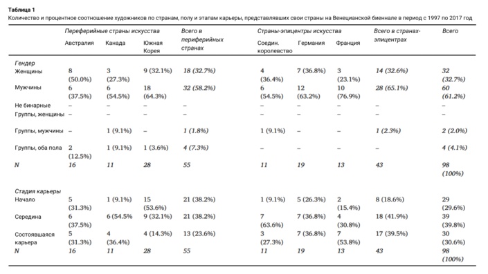 Если будет установлено, что существует универсальный «эффект Венеции», то возникает второй вопрос: насколько по-разному этот эффект проявляется в различных по характеристикам группах участвующих художников. В арт-сфере на том же уровне (если не больше), что и в других областях, распространены так называемые «модели преимущества» (см., например, Guerilla Girls 2020). Для понимания вариативности развития карьеры художников предполагается учитывать, как образом те или иные меры воздействуют на нее (вариативность – прим.) в зависимости от индивидуальных особенностей художников: пола, расы, этнической и классовой принадлежности, инвалидности. В данной статье основное внимание уделяется тем характеристикам, которые публично фиксируются или идентифицируются: пол, развитие карьеры и представляемая художником нация («representing nation» – термин дан в оригинале).