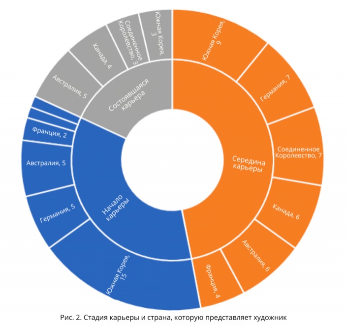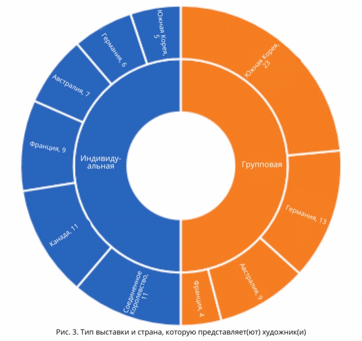 Что касается стадии карьеры, в периферийных странах искусства наблюдается тенденция к отбору художников на ранних стадиях карьеры (38%) по сравнению со странами-эпицентрами искусства (30%). В частности, Южная Корея выделяется тем, что отбирает художников в начале их карьеры: более половины из них участвуют в биеннале в течение первых 10 лет после своей первой профессиональной выставки. Для сравнения, пропорция австралийских художников на разных стадиях карьеры за этот период относительно одинаковая, в то время как из Великобритании только один художник (менее 10%) был отобран на ранних этапах карьеры. Страны-эпицентры искусства значительно чаще представляют уже состоявшиеся художники – 39,5% по сравнению с 23,5% в периферийных странах искусства. Как в периферийных странах, так и в странах-эпицентрах искусства наблюдается похожее соотношение художников, находящихся в середине их карьеры. Как видно из табл. 1 и рис. 3, количество художников, представлявших каждую страну, также различается. Так, Южная Корея за 20 лет направила 29 художников или коллективов, отдавая предпочтение групповым выставкам. От Канады и Великобритании участвовали всего 11 художников, чаще всего с персональными выставками.