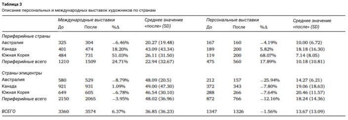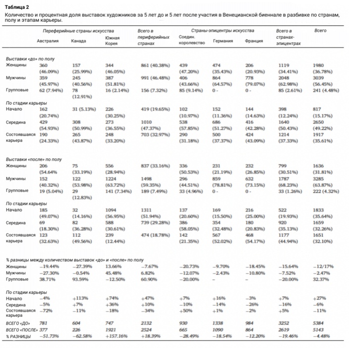 После формирования выборки было подсчитано количество выставок, в которых участвовал каждый художник, за пять лет до его участия в Биеннале и в течение пяти лет после. В табл. 2 приведена сводка данных по выставкам, проведенным художниками. Выставки разбиты по странам и далее – по полу и стадии карьеры художников.