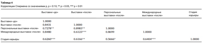 В табл. 4 приведены корреляции Спирмена, позволяющие учесть этап карьеры, который включен как ранжированная переменная, отражающая последовательность стадий от «начала» до «состоявшейся» карьеры. Как видно из полученных результатов, этап карьеры оказывает статистически значительное влияние на выставочную деятельность. Величина и положительный коэффициент указывают на связь между этапом карьеры художника и выставочной деятельностью: по мере развития этапа карьеры растет и количество выставок. Особенно взаимосвязь сильна в контексте выставочной деятельности до участия в Биеннале. Это согласуется с данными предыдущих таблиц, согласно которым уже состоявшиеся художники чаще отбираются на Биеннале и имеют большее количество выставок.
