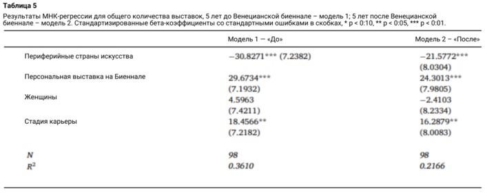В табл. 5 представлены результаты линейной регрессии для двух моделей Метода Наименьших Квадратов (МНК – математический метод, который используется в том числе при анализе статистических данных – прим.), где зависимой переменной является общее количество выставок до (модель 1) и после (модель 2) Биеннале. В модели 1 все переменные, за исключением пола (в основном женского), крайне важны. Однако следует иметь в виду, что отсутствие значимого результата по полу не объясняет, почему художники-женщины с меньшей вероятностью отбираются на Биеннале. Это требует дальнейших исследований. Все остальные переменные значимы. То, что художник представляет периферийную страну искусства, оказывает негативное влияние на общее количество его выставок. В то же время те авторы, которые участвуют в Биеннале индивидуально, отличаются большим количеством выставок как до, так и после Биеннале, по сравнению с художниками, которые участвовали в составе команд. Стадия карьеры также значима в обеих моделях. Художники, находящиеся на ранних стадиях карьеры, имеют значительно меньшее количество выставок даже после Биеннале, уже состоявшиеся художники. Возможно, это отражает относительную нехватку времени у авторов в начале и середине карьеры на разработку своего портфолио. Однако показатели их выставочной деятельности после Венеции говорят о том, что их участие в Биеннале все равно не дает быстрых результатов.